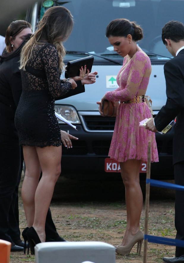 Ana Beatriz Barros apostou nos tons de verde, como vocês podem ver na blusa e na calça. Para completar, uma jaquetinha e bolsa rocha. Já Fernanda Souza foi com um vestido nude super decotado e com franjas. Não curti muito não. Acho que esse tipo de decote fica melhor para quem tem os seios menores!