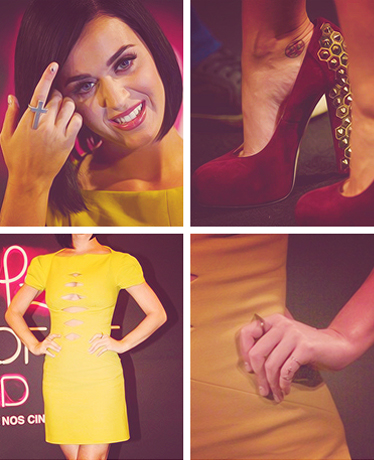 Para o photocall, a Katy preferiu um look mais sexy, diferente do que ela havia usado mais cedo.O modelo era um Versus amarelo com vários recortes. Mas o melhor do look mesmo é o sapato maravilhoso, que é Brian Atwood. Reparem também nos anéis, super lindos!
