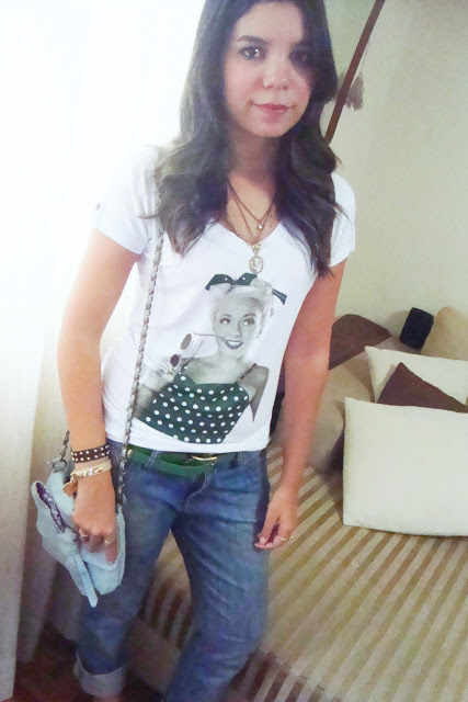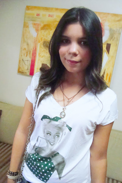Look simples para ir num churrasco. Aproveitei e estreei a blusa que eu comprei na Saara, pasmeeeem… R$11,00, hehe! Super fofaaa né? Adorei a estampa com a pin-up. Para completar o look, usei uma calça boyfriend, cintinho verde para combinar com a estampa da blusa e salto.