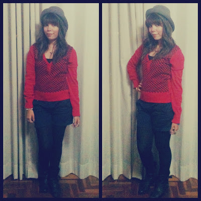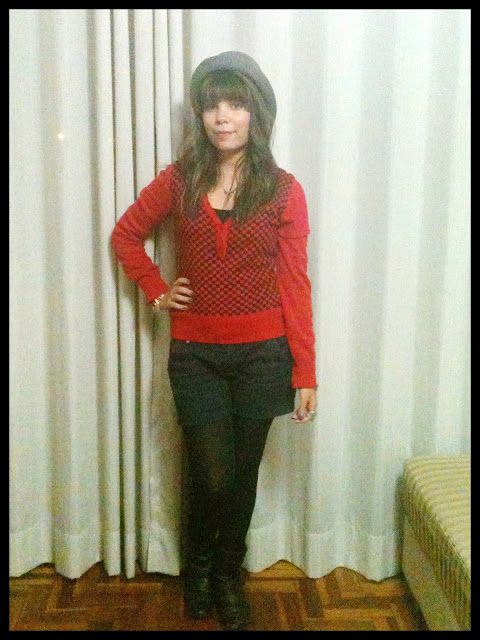 Como o tempo estava meio friozinho e ameaçando chuva, fui com um look quentinho. Escolhi esse cardigã quadriculado que é da Renner, shortinho azul marinho também da Renner, assim como a bota biker e chapéu da C&A.