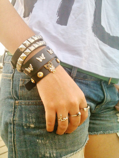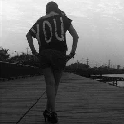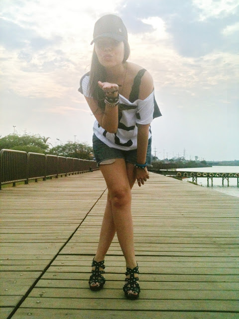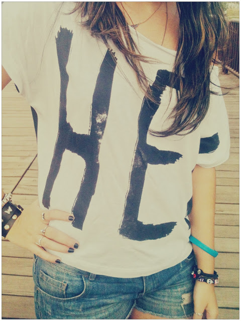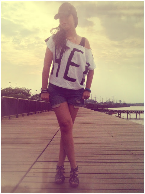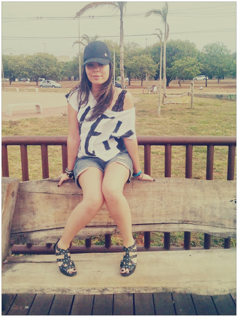O boné é da Renner, assim como o shortinho jeans. Já a blusa cropped “Hey You”, é da Marisa.