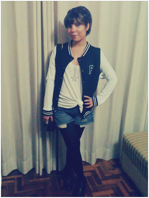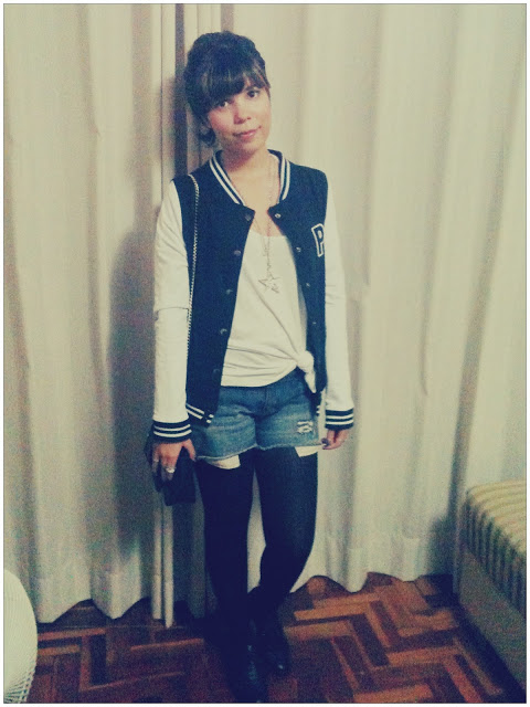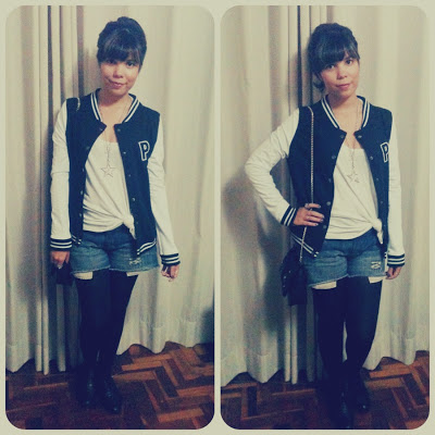 O look do dia de hoje é com uma peça que eu estava louca pra achar pra comprar e depois que eu comprei estava doida para usar, hehe! O meu casaco de baseball.  Vocês aqui no blog viram que eu cheguei a falar sobre essa tendência e também quando eu consegui achar um modelo na Renner, hehe! Então se preparem, porque eu acho que vocês vão o ver bastante aqui no blog, tô apaixonada!