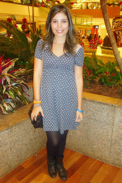 Quanto ao look, eu estava meio com pressa e atrasada, por isso acabei escolhendo esse vestido que é da Renner e eu adoro, ele é super fofo e confortável. Pra completar o look, usei meia calça preta e a minha bota biker que também é da Renner. Já a bolsa é da Fulô.