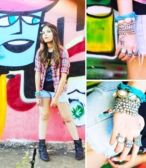 A t-shirt da mulher gato é da Renner, já a blusa xadrez, é da C&A. O shortinho jeans foi eu que fiz e a botinha e a bolsa também são da Renner.