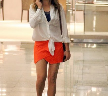 Pra montar o look, eu usei uma regatinha cinza, um blazer branco (tô in love com ele! Não consigo tirar, hehe), shortinho de renda laranja e sapatilha!