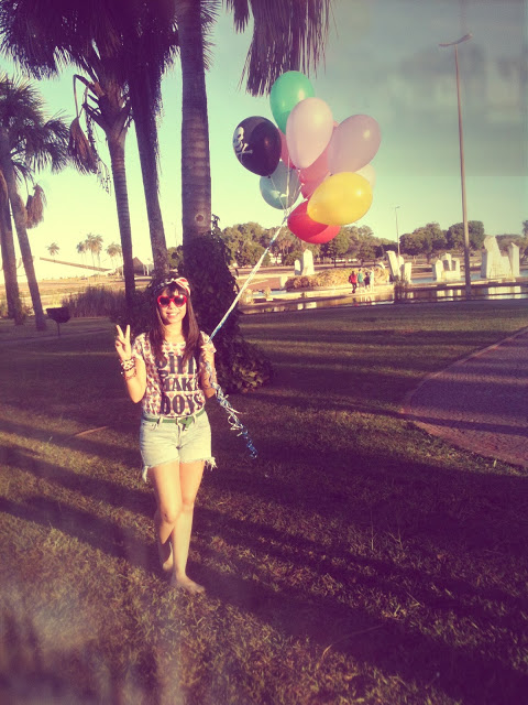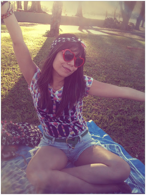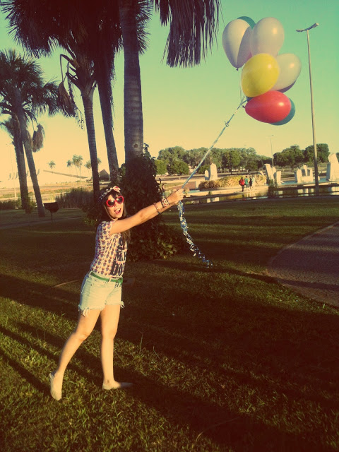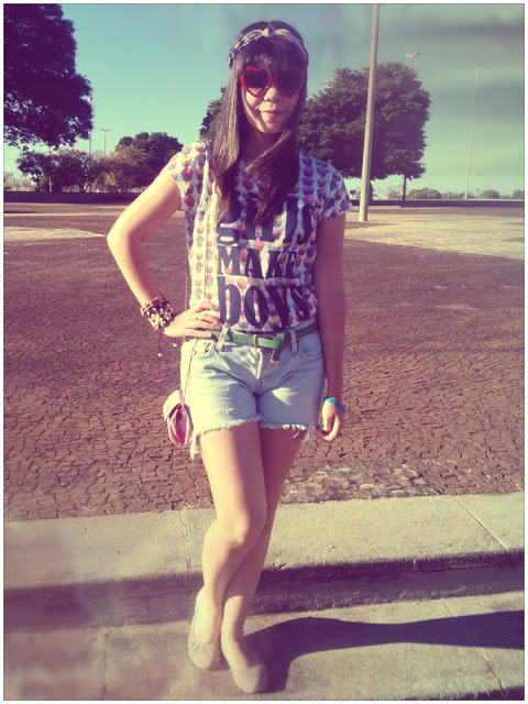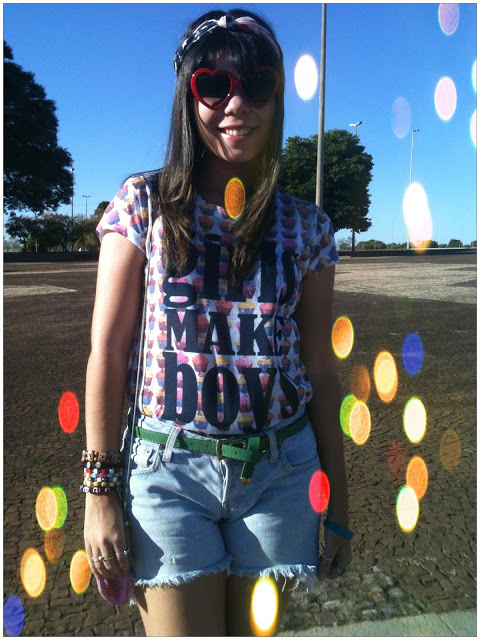 Para montar o look, escolhi essa t-shirt com estampa de cupcake da Renner, shortinho jeans feito de uma calça jeans velha, cintinho da Marisa, sapatilha de bailarina também da Renner e os óculos de coração da House of Vintage.
