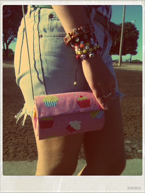 A bolsa com estampa de cupcake eu comprei na Feirinha de Ipanema!