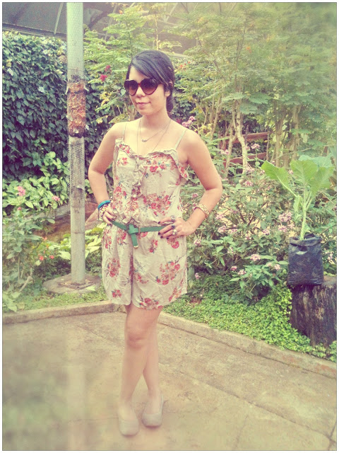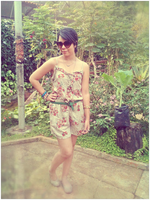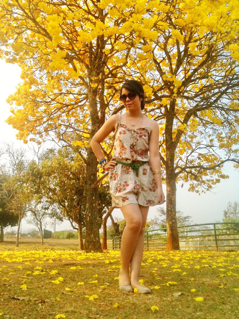 E já que o calor aqui em Brasília está de lascar, eu finalmente pude estrear o meu macacão curto (ou seria macaquinho? Hehe)! Comprei no final do ano passado e ainda não tinha tido a oportunidade de usar! Ele é super levinho, então foi a melhor opção para o look do dia. Ele é da Marisa, assim como o cintinho verde e os óculos de coração. Já a sapatilha é da Renner!