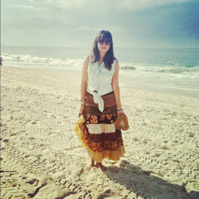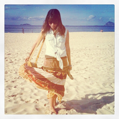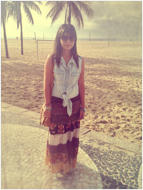 Eu quis compor um look mais boho e por isso escolhi essa maxi saia super linda e diferente. Ela foi comprada num atelier que tem aqui do lado da minha casa, ou seja, ele não tem uma marca. Eu adoro a mistura de tecidos e estampas dessa saia, que é o que a faz ficar mais ainda com esse ar de ciganinha. Para completar eu escolhi essa blusa jeans que eu comprei na Marisa. O sapato é aquela sapatilha estilo bailarina que eu comprei na Renner e a bolsa também é da Marisa, assim como os ósculos de coração.