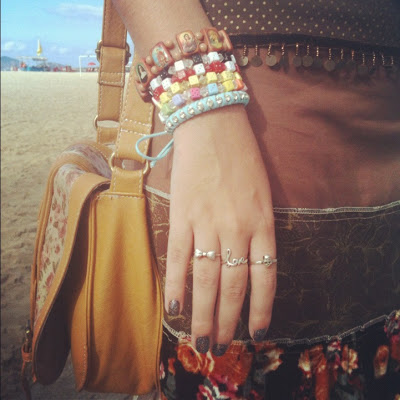Para compor a produção eu fiz um mix de pulseiras e usei os meus anéis novos de prata que eu comprei na feirinha de Ipanema.