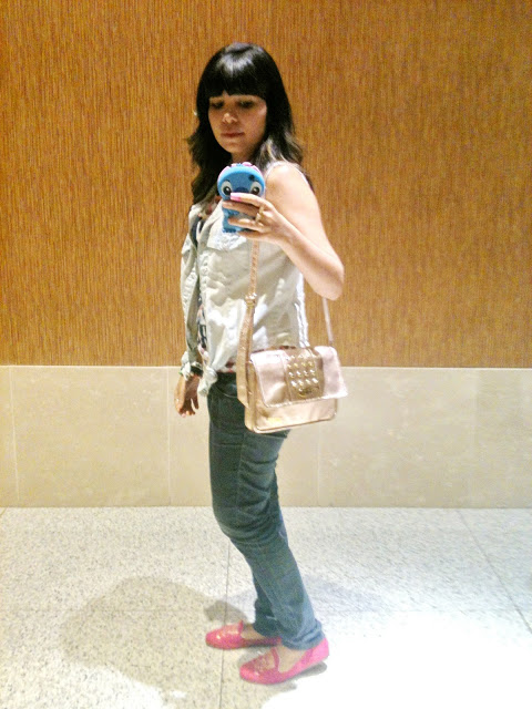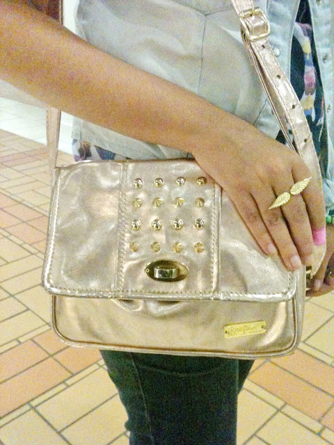 Como eu já comentei no outro post de look do dia, tô in love com essa bolsa! Ela é rosinha metálico com tachinhas douradas! Linda, né?!