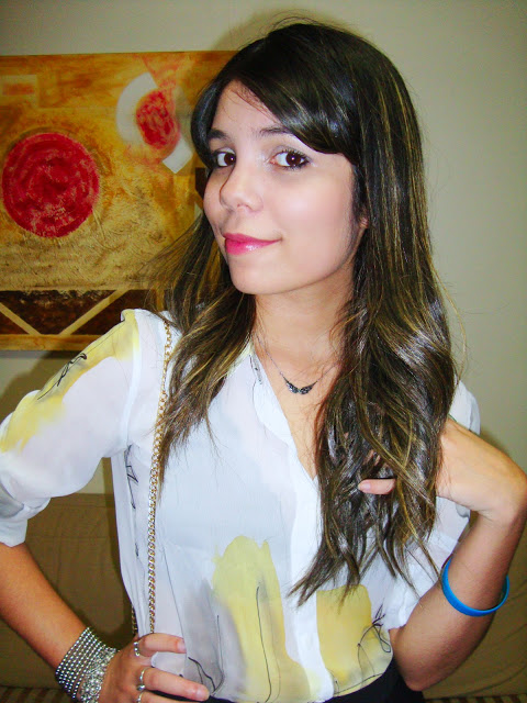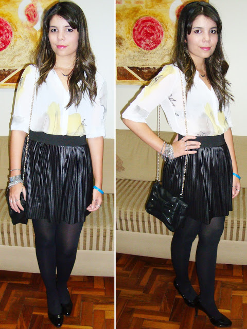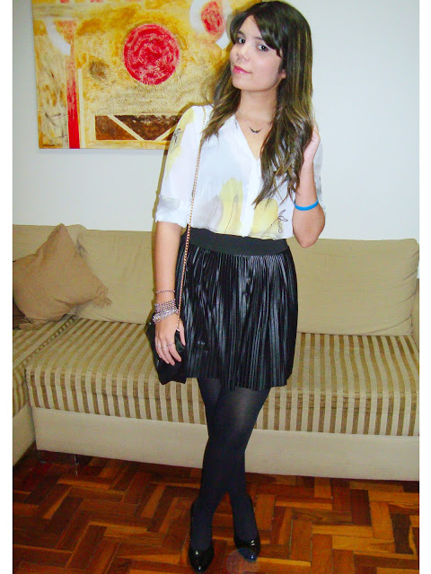 Para montar o look, eu escolhi essa camisa que é da marca Street Fashion, a saia plissada que é da C&A, sapato da Renner e a bolsa é Fulô. Para completar o look e não passar aquele friozinho, meia calça preta.