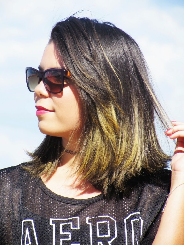 E o look de hoje tem uma pitada de anos 90! Tem shortinho jeans com a cintura mais alta, blusa sporty e colar tattoo chocker!