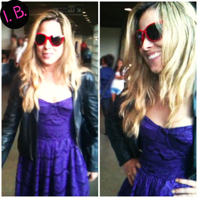 O look estava super fofo! Ela misturou uma peça mais romântica, o vestido, com elementos mais rocker! A mistura ficou incrível e deu nesse look! Vestidinho roxo rendado com jaqueta de couro e sapato baphônico!