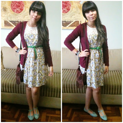 E pra encerrar o post, separei umas fotos também do look que eu usei no encontro com ela! Para montar esse look mais girlie, usei o vestidinho florido da Loja Emme, cintinho pra marcar a cintura da Marisa, cardigã, bolsa de franjinhas da C&A e sapatilha, que também é da Loja Emme!