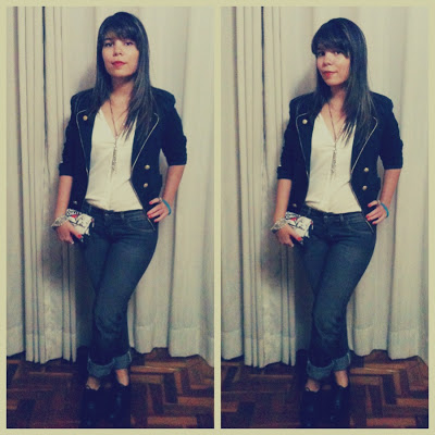 Para compor o look, escolhi essa camisa branca que é Street Fashion (gente, não sei de onde é essa loja, hehe), esse blazer bem paquita meets Michael Jackson que eu adoro, ele é da Renner, calça jeans preta da TNG e para fechar e dar aquele toque Tomboy, o oxford, que também é da Renner.