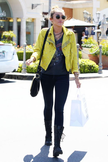 Para montar o look com essa carinha boho rocker, a Miley usou uma regatinha com estampa de banda, calça jeans skinny, jaqueta amarela com tachinhas e coturno. Para dar o ar boho, colares e pulseirinhas, além dos óculos com armação redonda. A jaqueta amarela por cima deu uma cor ao look que estava mais escuro e ficou pertfeitooo!