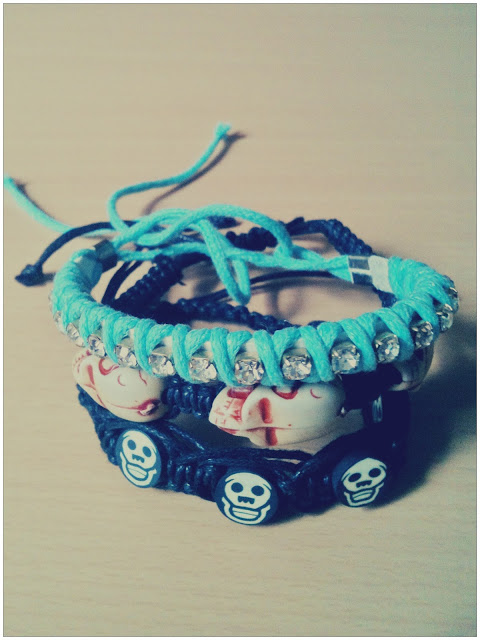 Lá eu também comprei essas pulseirinhas da amizade que estão super na moda. Olhem só que legais essas de caveira! Cada uma é R$ 10,00 e se vocês levar três sai por R$ 25,00. Eu sei que se fosse no Saara eu teria comprado com esse dinheiro umas vinte, mas como disse, a feirinha foi o que me restou, hehe!