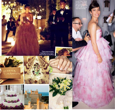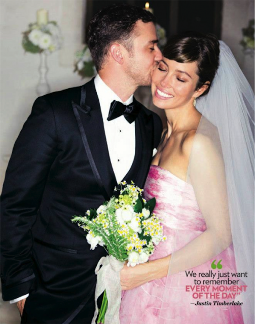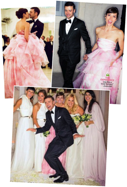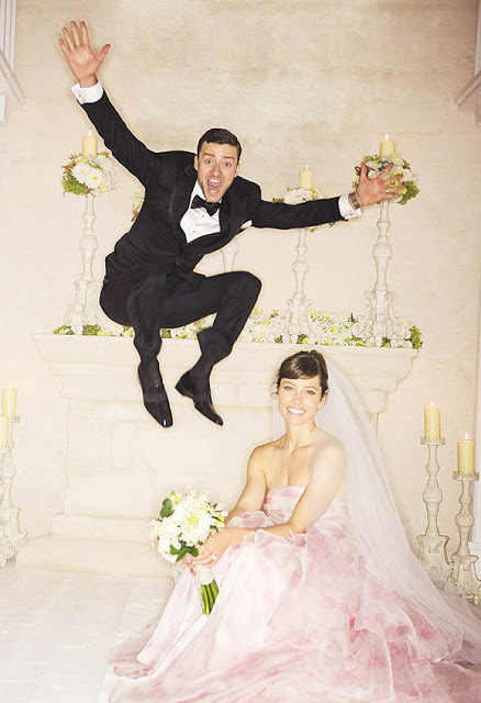 Agora genteeee… o que me deixou chocada foi o vestido da noiva, que era ROSA! Sim, ROSA, haha! O modelo Giambattista é bem bonito, mas achei bem ousado hein! Tem que ter coragem pra casar de rosa! A Jessica estava linda e fofa, enquanto o Justin estava todo sexy back com o seu Tom Ford.