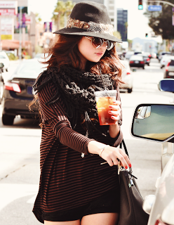 Quando vi esse look, fiquei apaixonada! Suuuper estilosa! E o que eu mais gosto é que apesar do super estilo que ela imprime no look com os acessórios, as peças são básicas, ficando fácil de a gente se inspirar e copiar! Pra esse look ela escolheu uma blusa de manga comprida listrada, shortinho jeans preto, scarf, chapéu e botinha, que faz parte da marca dela, a Dream Out Loud!