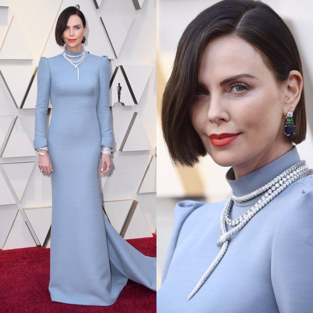 Charlize Theron apareceu morena nesse Dior azul! E o colar?! Ryca!