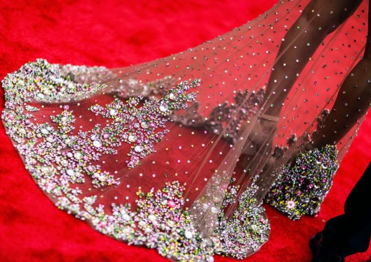 Saoirse Ronan estava linda e foi com um brinco de cada cor! E reparem como esse tecido é lindo de perto!