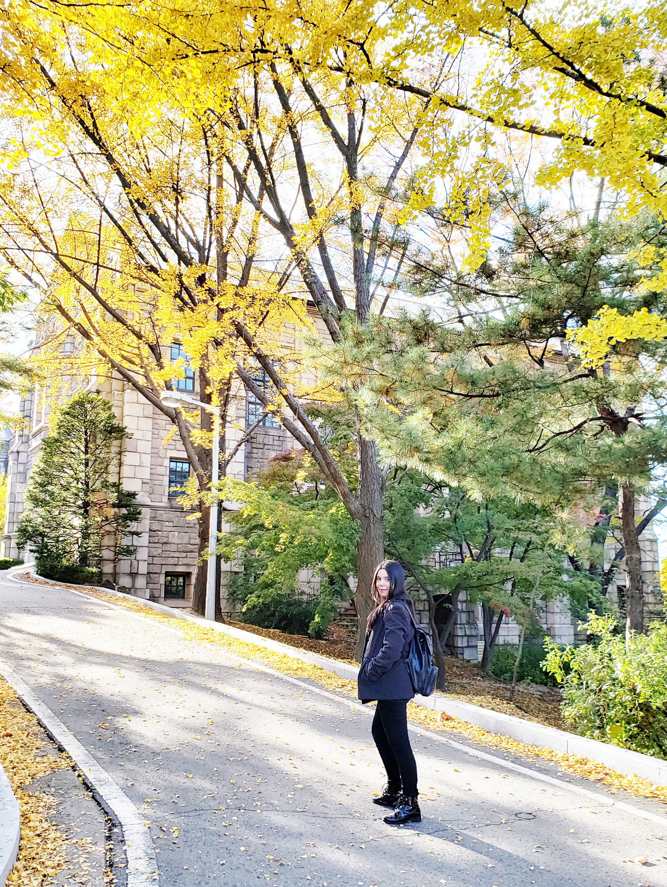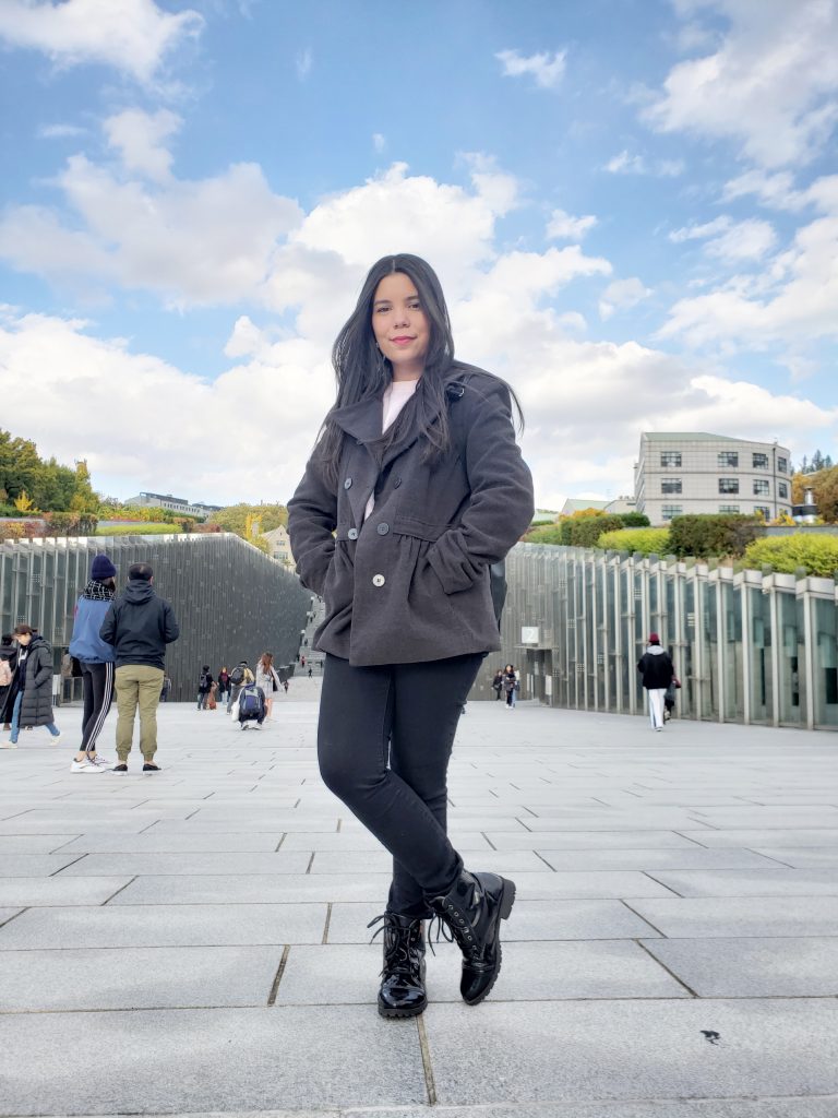 Falando do look do dia, procurei escolher um que fosse confortável para poder bater perna. Em Seoul estava fazendo bastante frio, por volta de uns 15° graus, então era bem difícil não se empacotar toda, ainda mais a gente que no Brasil está acostumado com um super calor. Mas tentei fingir costume e usei uma saia, haha! Gente, não importa o frio que faça, as coreanas usam mini saias e isso me deixava de boca aberta, haha! Mas para não passar frio usei como meia calça essa calça térmica e ficou tudo certo. Quis montar um look que tivesse tons de preto e cinza e por isso usei a saia plissada preta, e a blusa e jaqueta com tons de cinza! Nos pés um coturno para aguentar a bateção de perna, hehe!