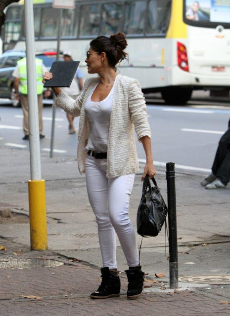 A atriz escolheu peças bem claras e contrastou com acessórios escuros. Calça branca, regatinha clara e casaquinho nude e contrastando, cinto, bolsa e tênis pretos. Aliás, o sneakers estilo Isabel Marant ( na verdade deve ser Isabel Marant) tá suuuuper na moda e ajuda a dar o ar descontraído ao look!