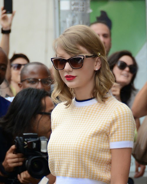 É… difícil né?! Haha! Mas falando do look, gente… amei demais! Acho que hoje em dia a Taylor é o meu maior ícone de moda! Juro que babo em todos os looks e me seguro para não postar os looks dela todos os dias, hehe! Agora esse tava tão fofo! Diz se não parece uma boneca! Mais uma vez ela usou um look com carinha retrô, só que dessa vez com cores bem candy! Também amei a make, como sempre, e os óculos de sol! O grampinho no cabelo também estava muito fofo! Enfim, um look todo perfeito!