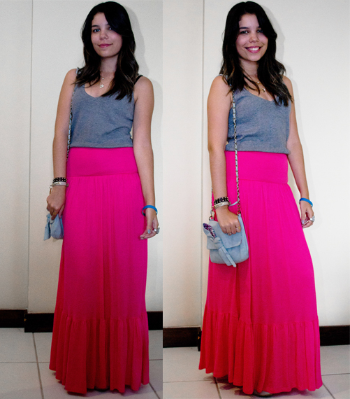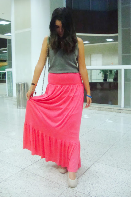 Apesar de não estarmos na primavera, o look do dia de hoje bem que poderia ser usado nessa estação ou até no verão. Como aqui em Brasília o tempo é doido e está fazendo um tempo bom e bem fresquinho, montei esse look bem simples e bem dia a dia com essa peça que vocês amam, a maxi saia. Ela ainda tá em alta e eu acho que vai demorar pra sair hein! O bom é que dá pra vocês montarem vários looks de estilos diferentes com ela. Nesse look, eu fiz uma produção bem simples e bem dia a dia.