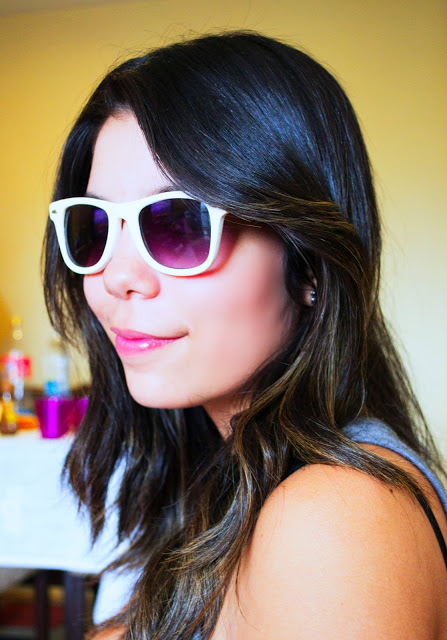 Para montar o look com a maxi saia rosa que é da Renner, usei essa regata branca que é bem comprida e fiz um nózinho, ela é da Taco. Por cima, joguei esse coletinho jeans e nos pés as minhas sapatilhas de bailarina que eu tanto amo, eles também são da Renner. A bolsa de zebrinha é da Santa Malagueta e os óculos de coração são da House of Vintage.