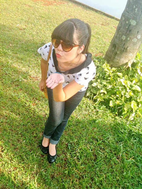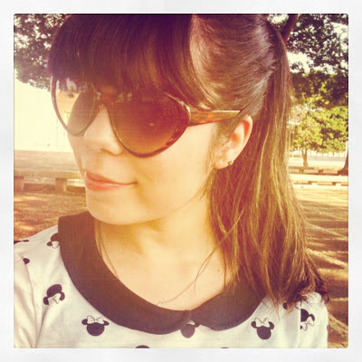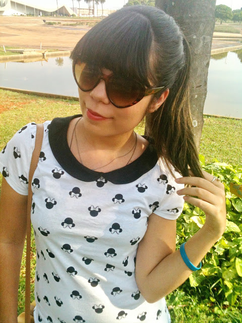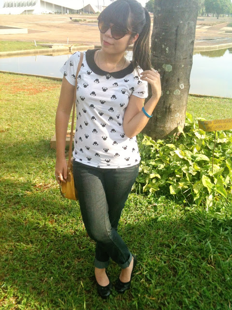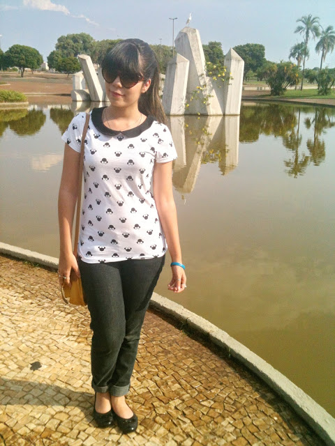 Para montar o look, usei essa blusa da Minnie que eu adoro, ela tem gola Peter Pan e é super fofa, comprei na Renner. A calça jeans é da Mercearia, a bolsa é da Renner, os ósculos são da Marisa e as sapatilhas, que são a minha nova aquisição, são da Mr. Cat!