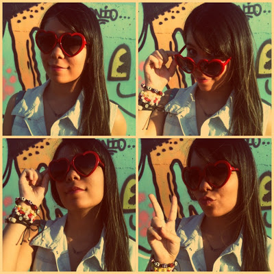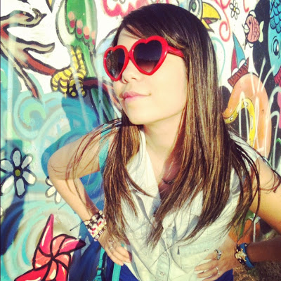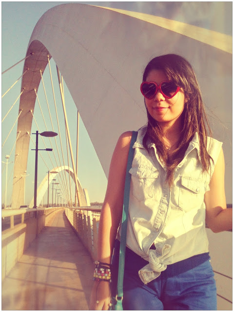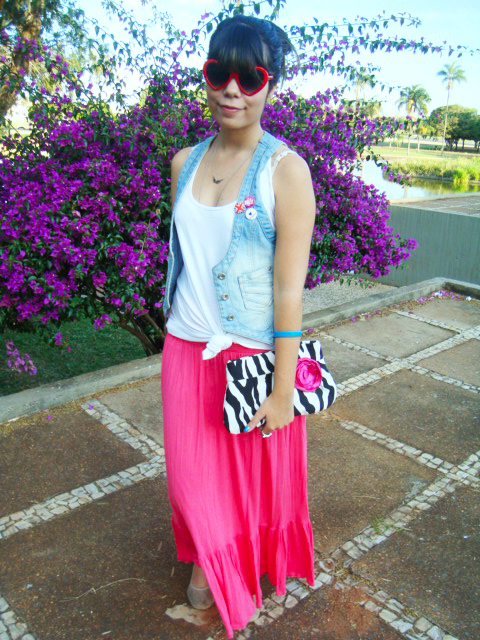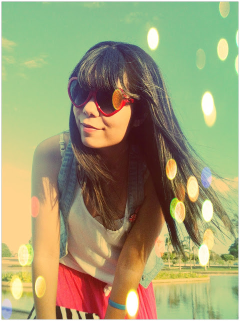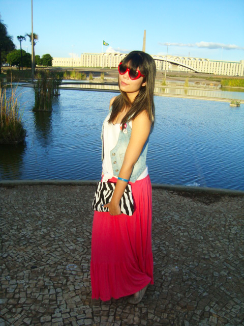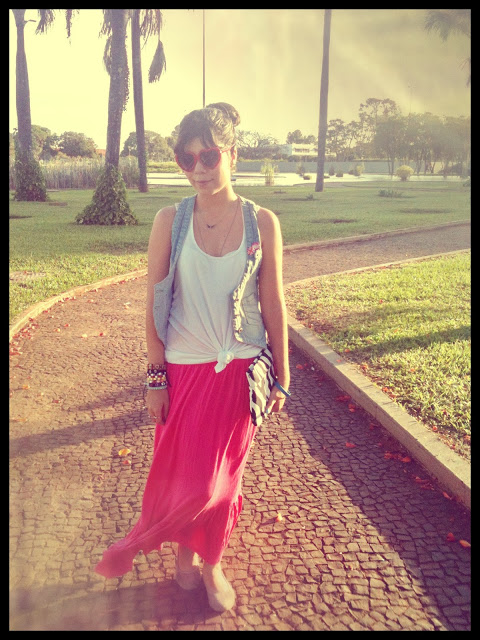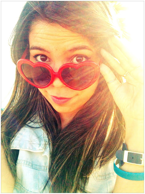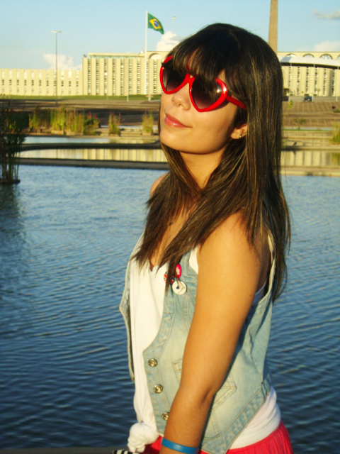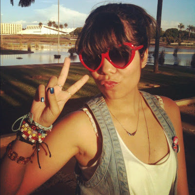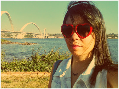 E já que o calor aqui em Brasília está de lascar, eu finalmente pude estrear o meu macacão curto (ou seria macaquinho? Hehe)! Comprei no final do ano passado e ainda não tinha tido a oportunidade de usar! Ele é super levinho, então foi a melhor opção para o look do dia. Ele é da Marisa, assim como o cintinho verde e os óculos de coração. Já a sapatilha é da Renner!
