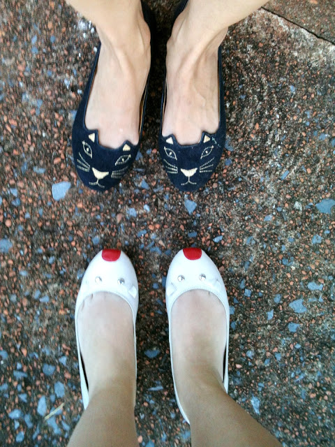 O look de hoje é bem fofo e por um motivo simples, minha nova sapatilha de ratinho! Siiiim, eu tenho uma, hehe! Eu tinha comprado antes de viajar e acabei não postando o look! Meus amigos me chamaram para ir no teatro e eu pensei… “é agora, vou estrear minha nova sapatilha”, hehe! E olhem só que surpresa, chegando lá a minha amiga Júlia estava usando a de gatinho dela, hahaha! Juro que não foi combinado!