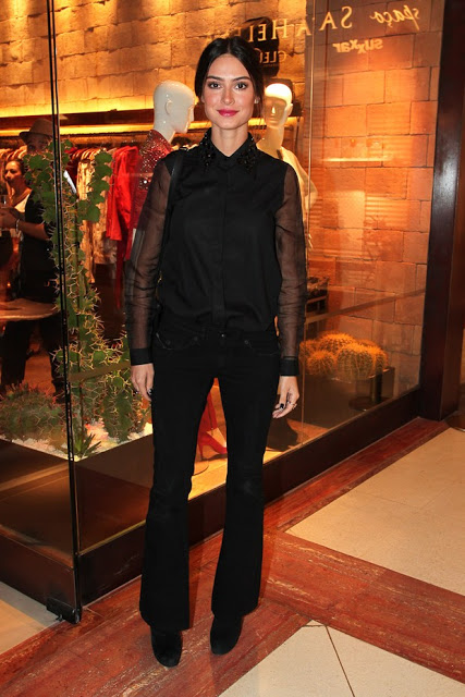 O segundo look usado pela atriz foi total black, mas nem por isso foi sem graça ou super básico. O charme do look ficou por conta da blusa, que tem as mangas transparentes e a gola trabalhada com pedras! Super linda!